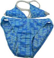 Gyermek 2 részes bikini, kék mintás, fehér hímzett pipa, felső része kötős, anyagösszetétel: 82% poliamid 18% elastán